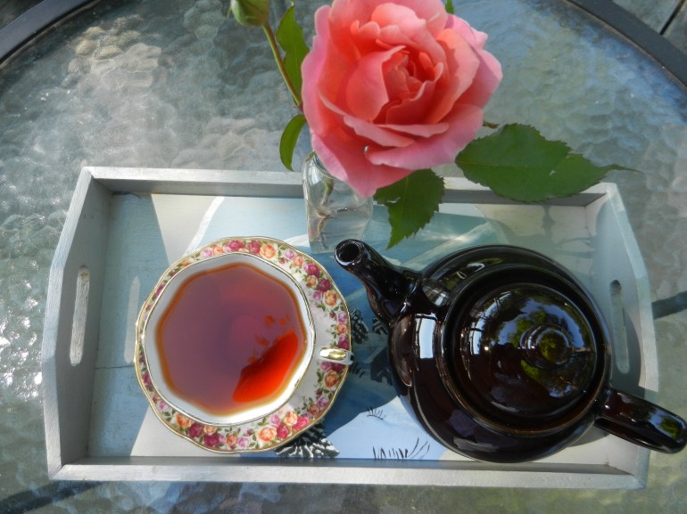 I poured myself my favorite Earl Grey loose tea from Bigelow Tea and used my Brown Betty teapot purchased from Bridgham & Cook last year. Some of my roses are starting to bloom, so I cut a single stem to adore my tray and use the lovely Old Country Rose, Peach Damask pattern of Royal Albert china.