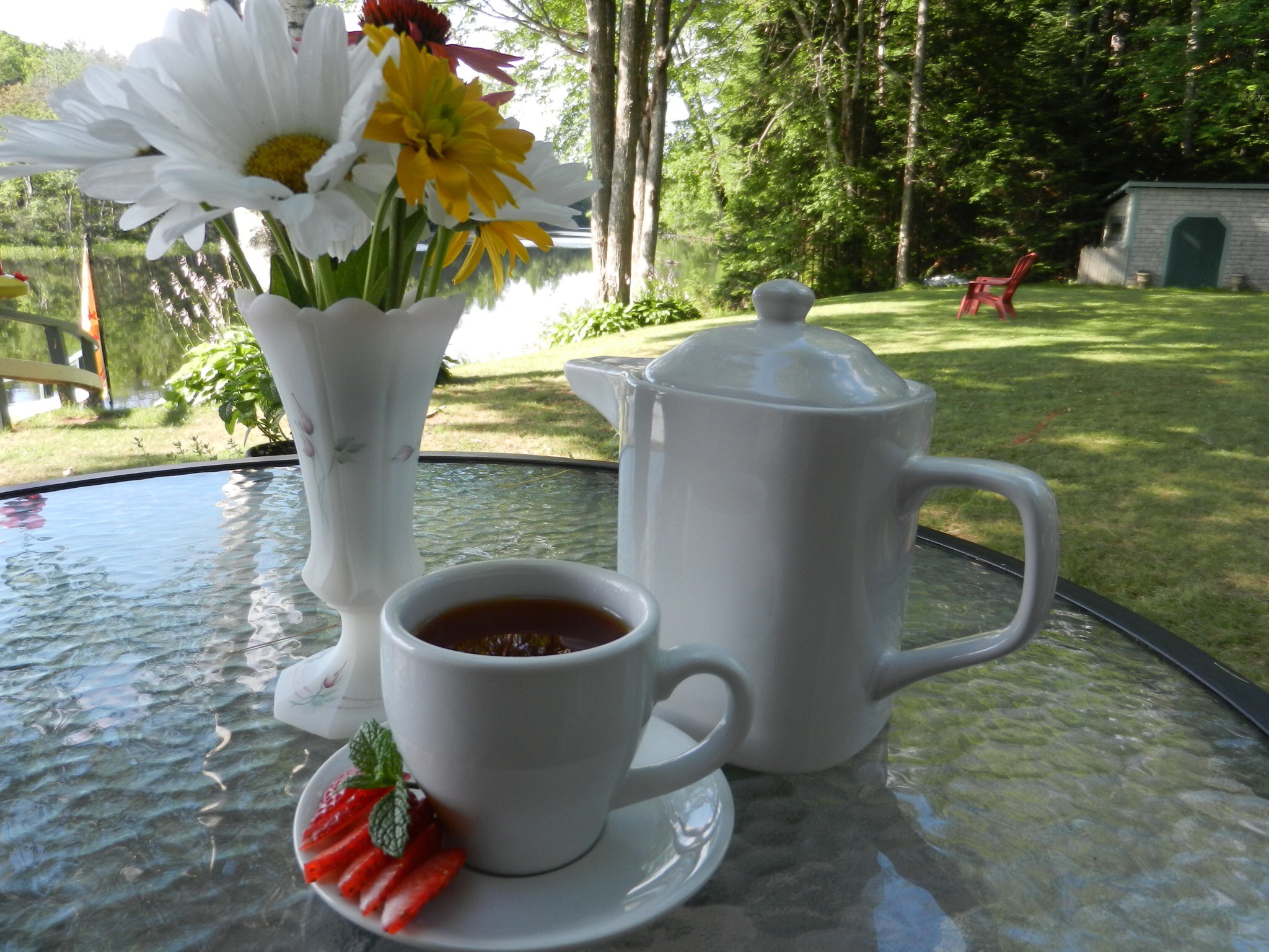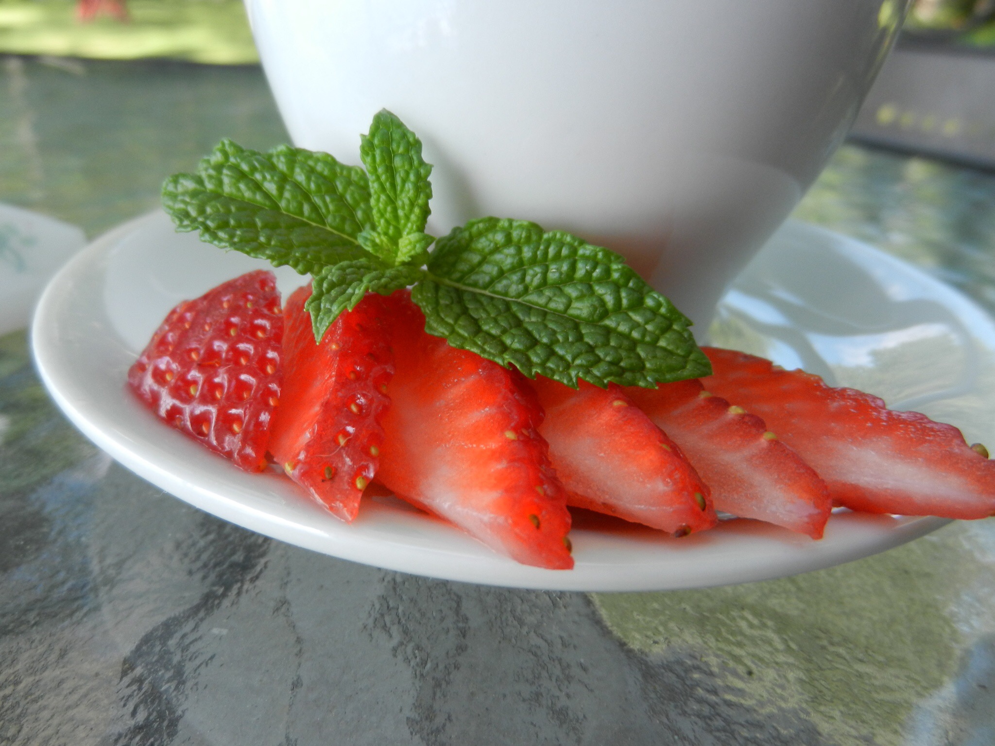To add some color, I cut some fresh strawberry slices and added a sprig of fresh mint from a container on my deck. If I had had the energy, a scone would have hit the spot, but I wanted to get outside before the temps got hotter.