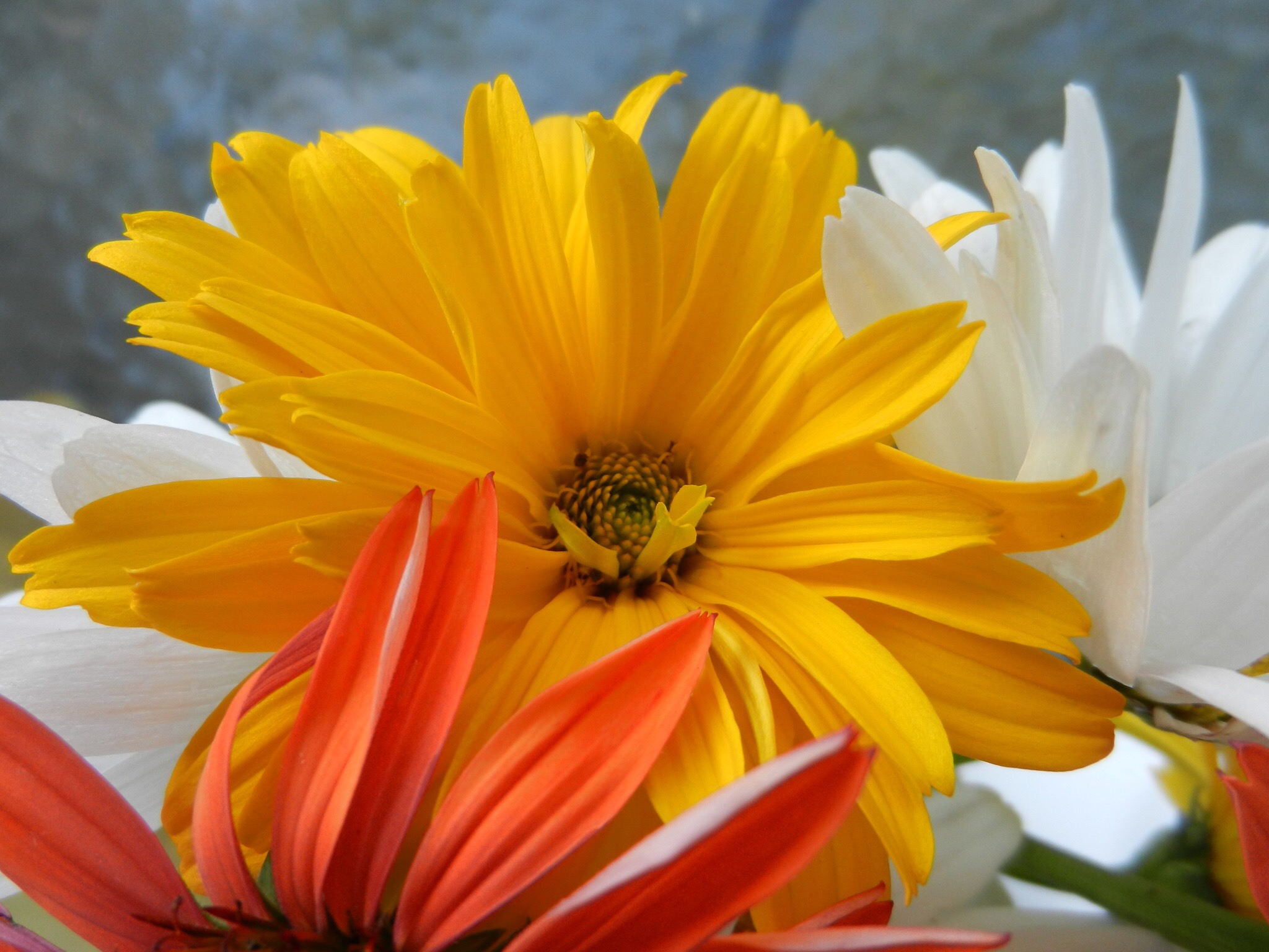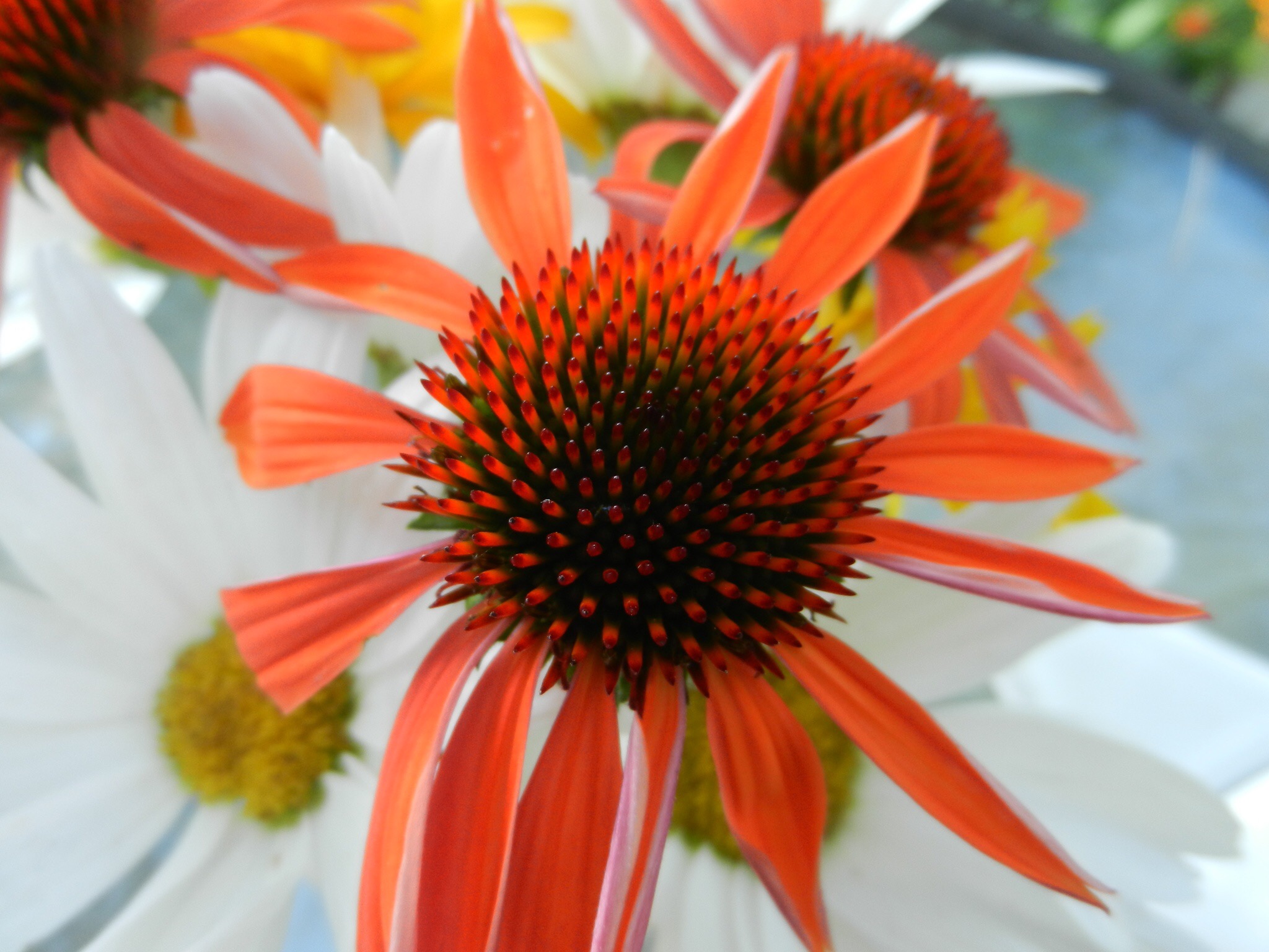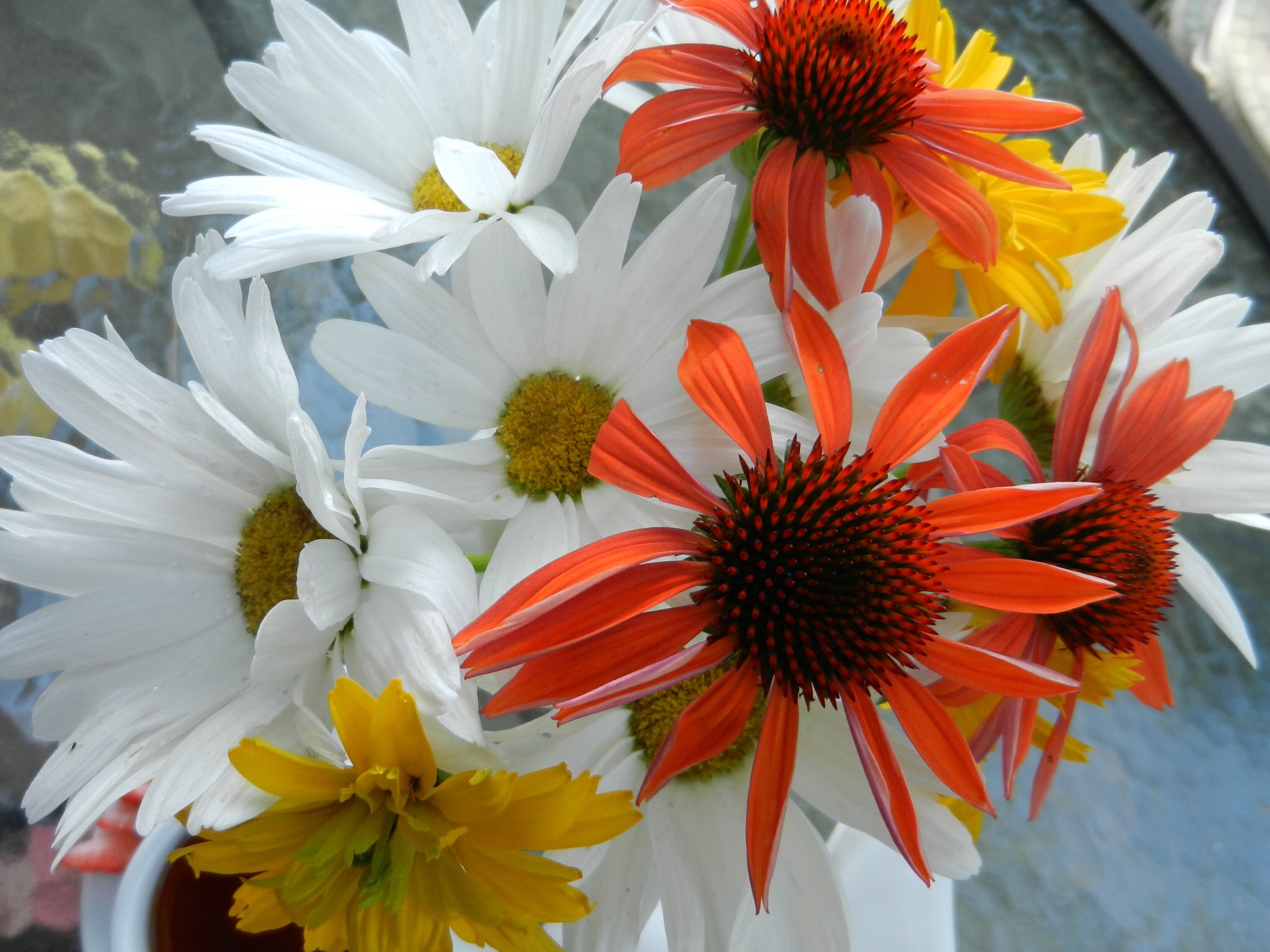It’s just a tick cooler out today and the perfect temperature to enjoy some tea out on the deck. I went out and cut some flowers from the garden for a wee bouquet. Not much to choose from at the moment as all the daisies are almost gone by and the entire garden is kind of in a lull. The lilies should be blooming in the next couple of weeks though. Something to look forward to! For this bouquet I was able to collect a few Heliopolis (yellow), Sundown echinacea (Orange) and my lovely white daisies. I JUST missed a wonderful bumble bee enjoying the echinacea in the bouquet on the table before I could grab my camera.