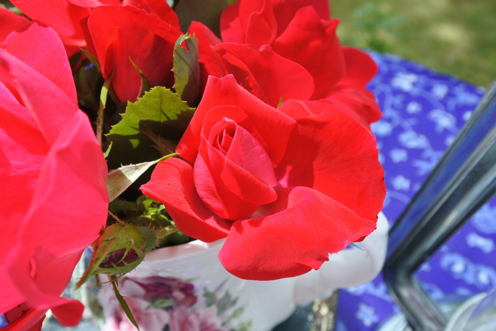 I cut some rose blooms off one of my shrub roses. Enough to just make a wee bouquet. It’s a shame all of the flowers on one stem don’t bloom all at once.