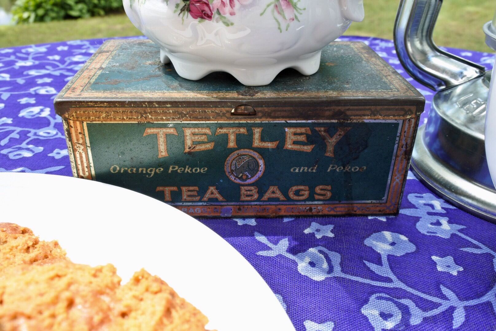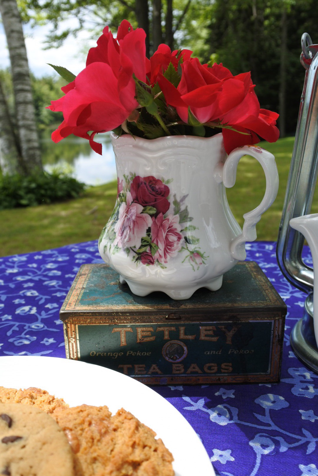 We already had some peanut butter and chocolate cookies so I gatherd up a lantern, a pretty pattern table, cloth and my old Tetley tea tin as a base.