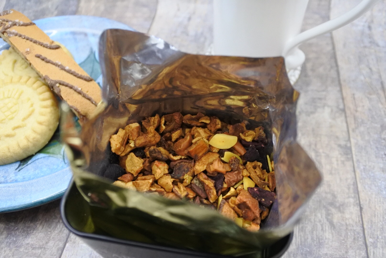 When you cut open the foil bag inside the tin and see the chunks of almonds, apples and beetroot, you know it’s fresh and not a pulverized crush of powder that has been sitting around on a shelf for years.