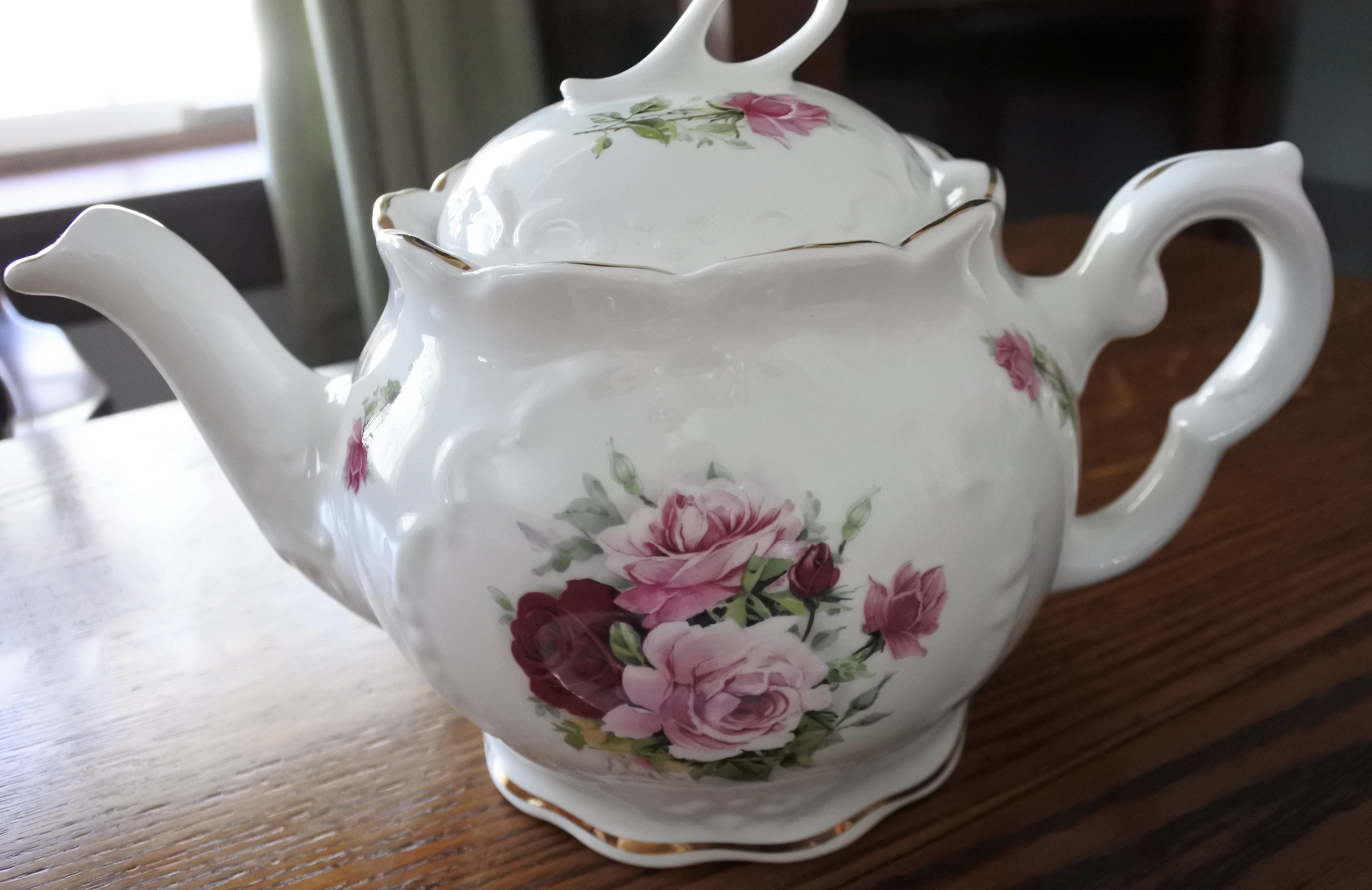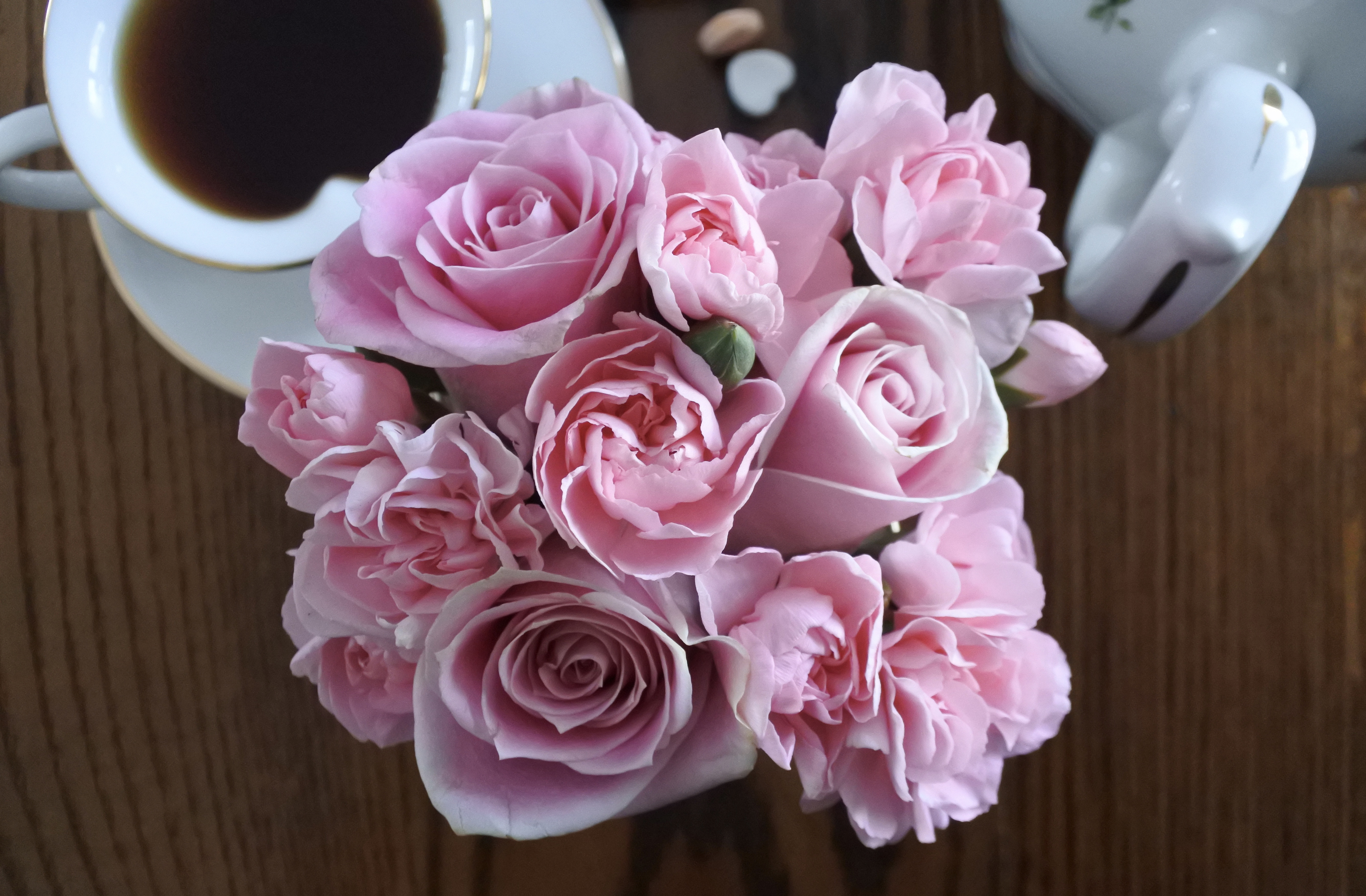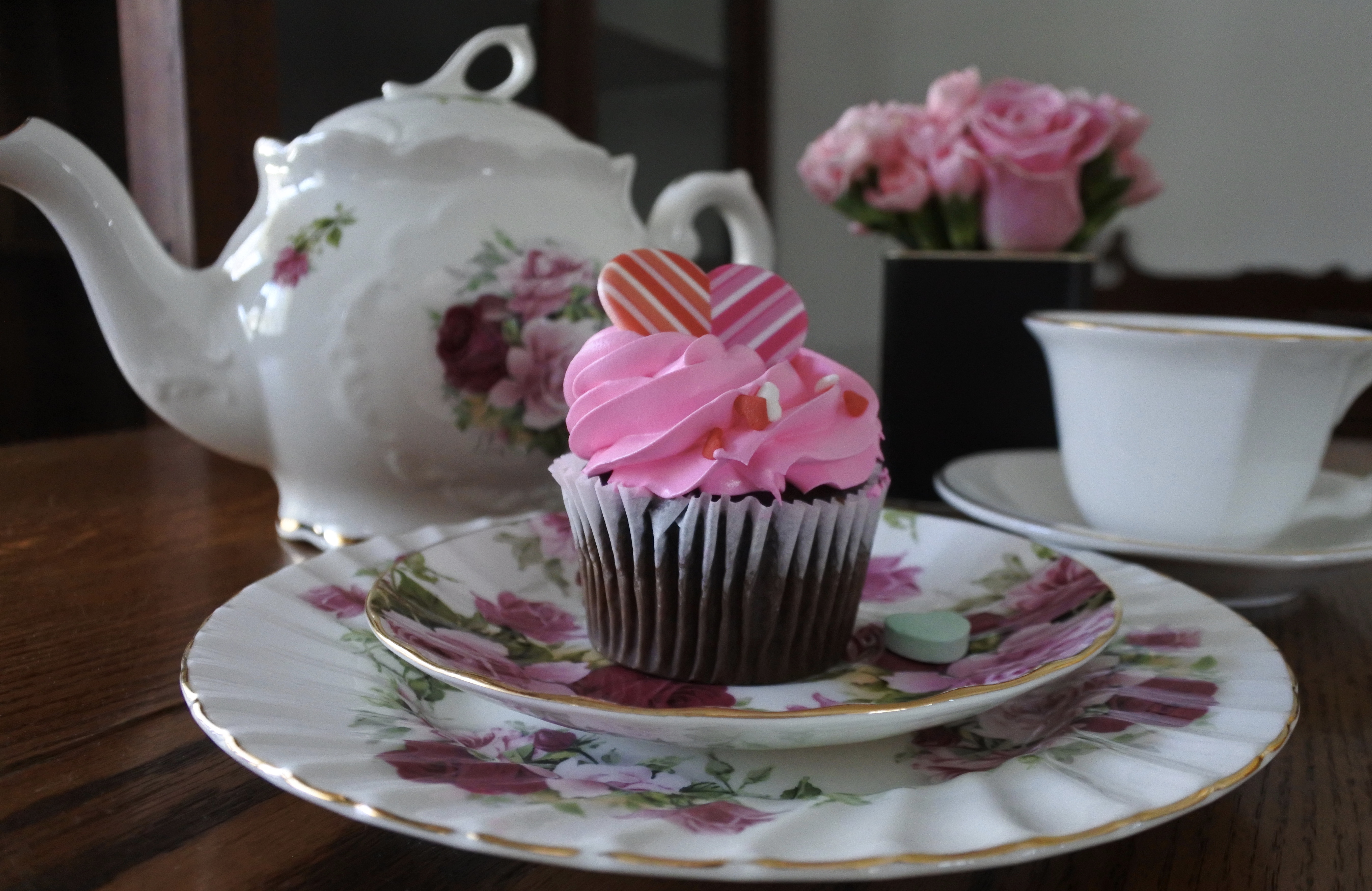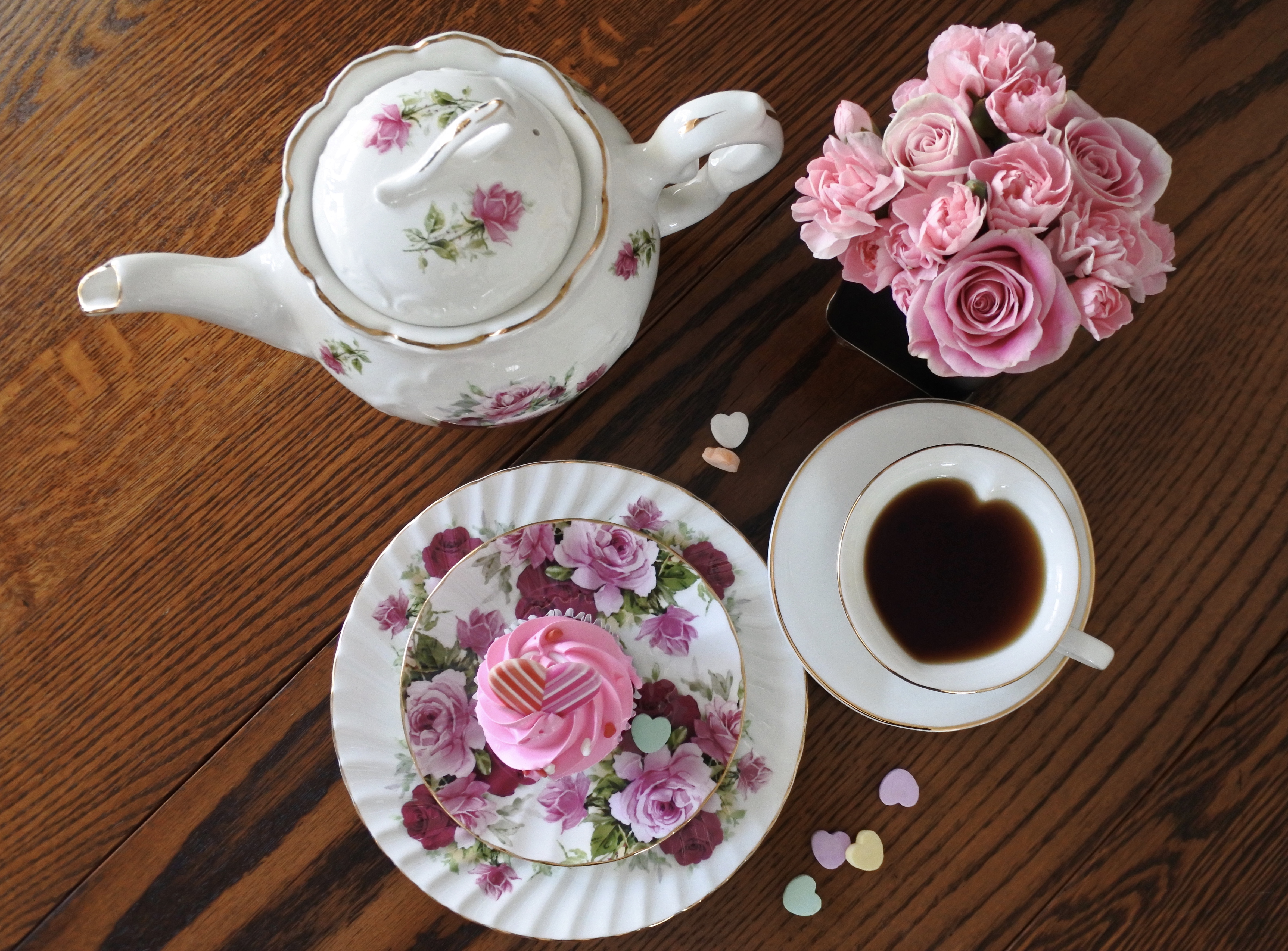 My annual cup of tea using the heart-shaped teacup & saucer my late sister gave me and one of my many rose-themed teapots. Paired with a delightfully charming chocolate cupcake and some pink roses and carnations.