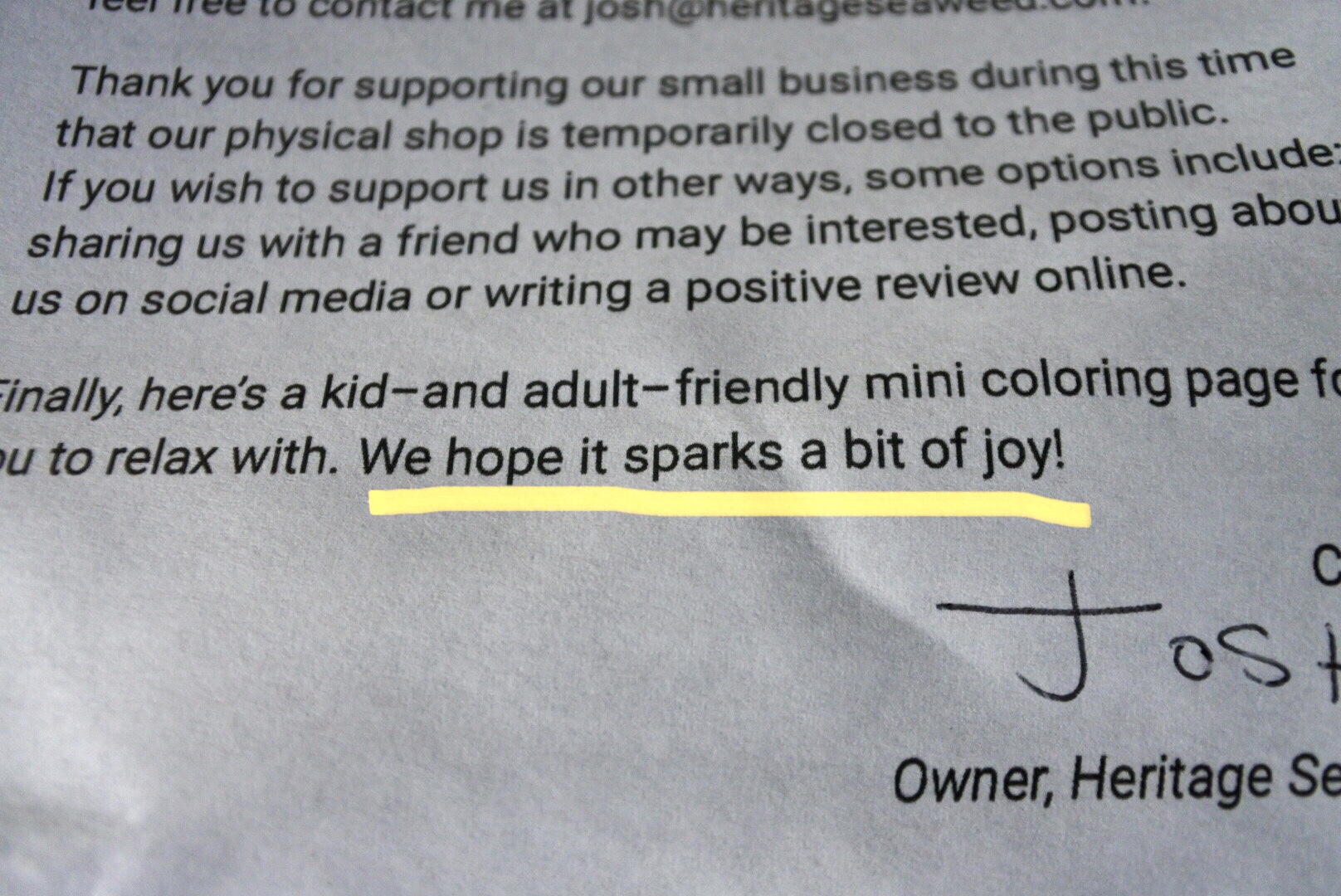 Of course, my bag of tea arrived in the mail very quickly. We are in the same state after all, but during this pandemic you can never be sure. The foil-line packet of tea was beautifully covered with custom labels and the package included a lovely personalized note from the owner, Josh. I found this to be a wonderful touch and the note also included an outline of their building surrounded by seaweed to use as a color page for children or adults alike indicating: “We hope it sparks a bit of joy!”.