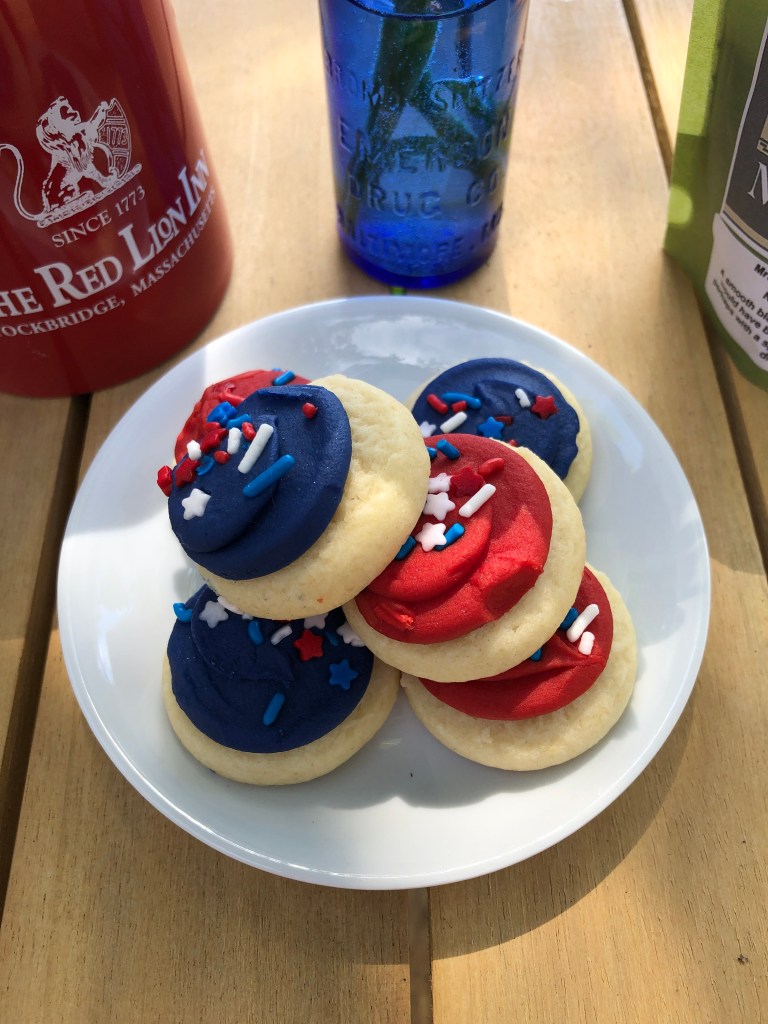The BLUE jar I used to hold the daisies are an old apothecary jar from the late 1800’s. Oh, and I have a little blue in the frosting of the cookies. I don’t own a lot of blue. So, you’ll just have to imagine how one could produce “vigilance, perseverance and justice” from a glass jar and cookie frosting. Perhaps seltzer from an apothecary jar assisted a family during the Revolutionary war which allowed them to remain vigilant and then persevere to be rewarded with cookies once justice was served?