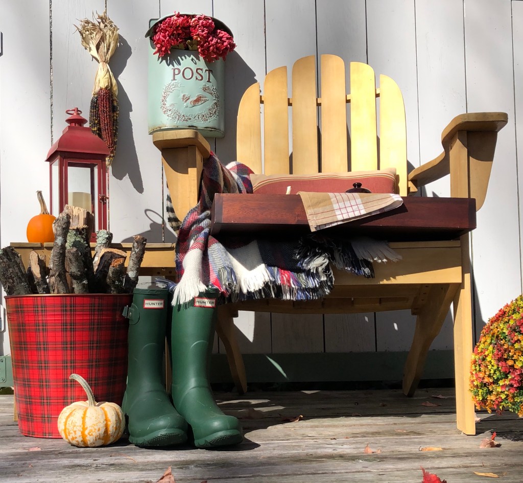 Wee pumpkins, red lantern, dried corn, and a cozy throw & pillow added a touch of texture and color. While the classic Brown Betty teapot offered up some depth.