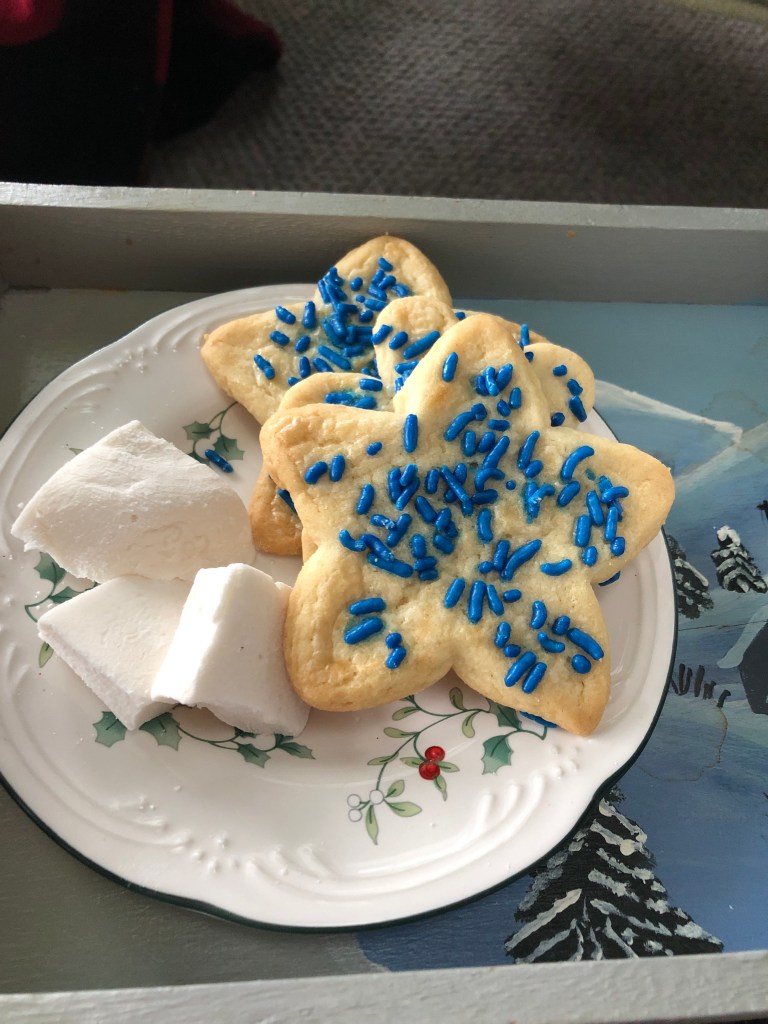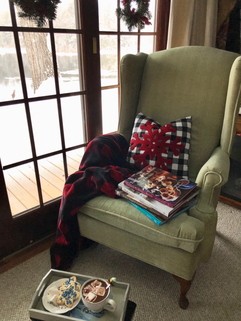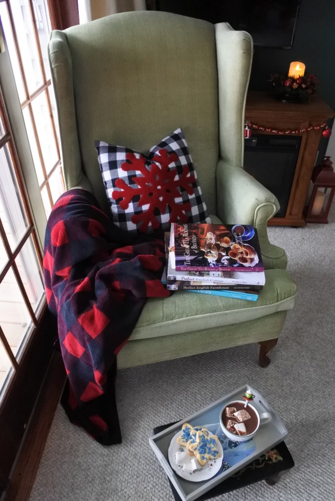 My warm, plaid fleece blanket and snowflake pillow were deemed appropriate for the wing-backed armchair. The tea-stained, hand-painted winter wooden tray my late-mother gave me years ago was used to handle the goods.