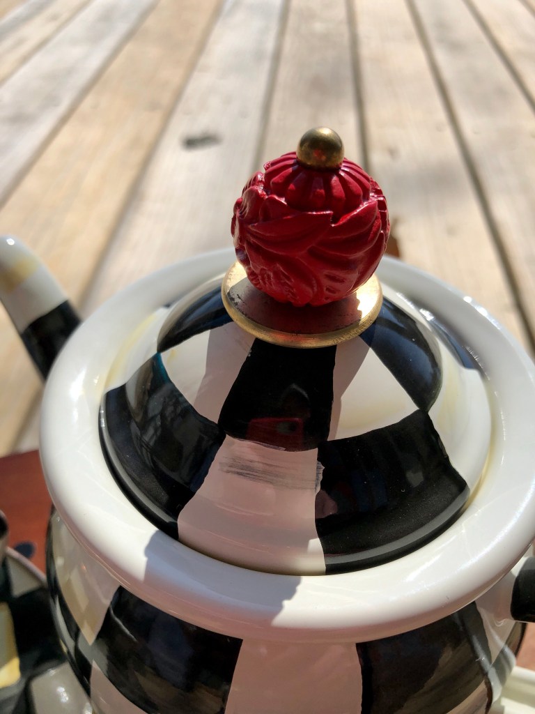 I had forgotten these three pieces were enamel. Not the more expensive clay pieces from M-C that has been kiln-fired three times. Their larger clay teapot goes for almost $400. Yes, you’re paying for artisan, craftsmanship, and hand-painted quality, but still….$400??? So, that’s why I opted for the smaller “Tea for Me” enamel teapot.