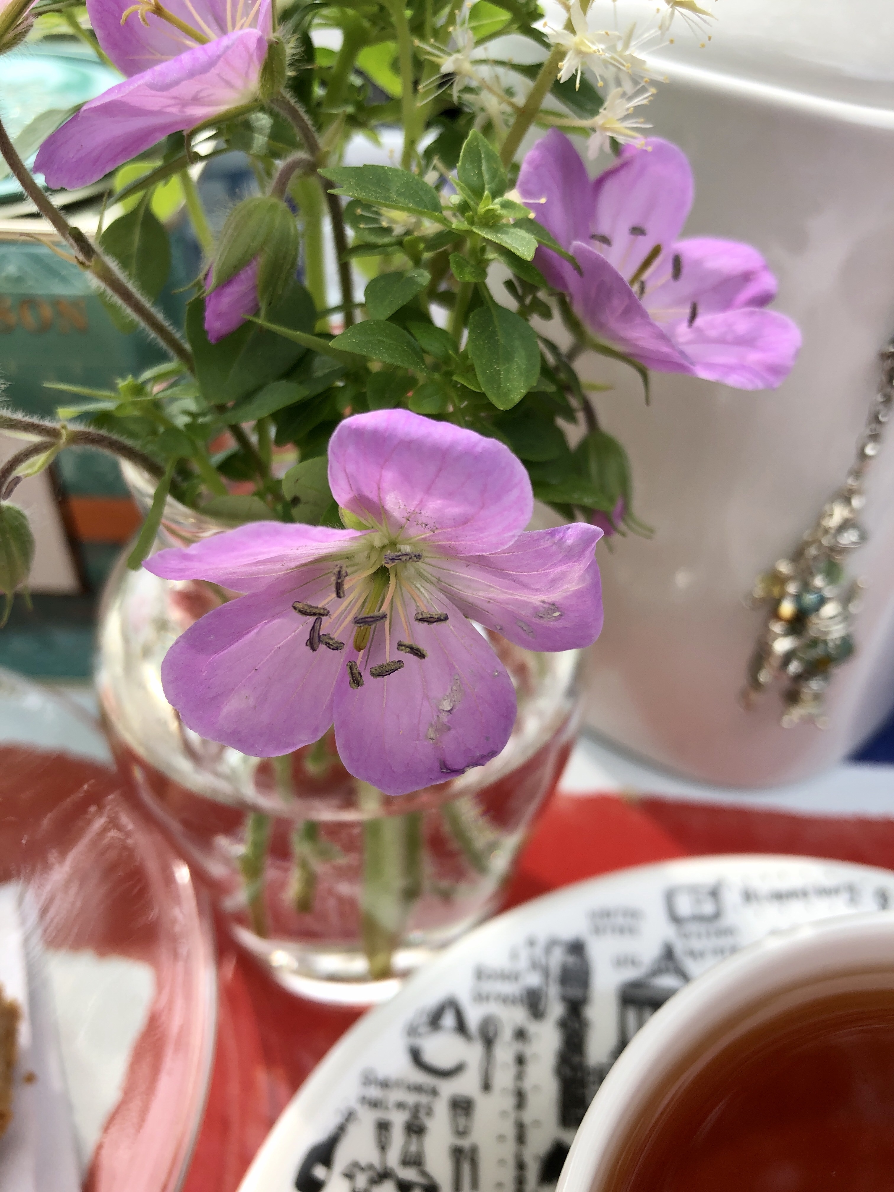 Unfortunately, there isn’t much in bloom at the moment in the garden, but some wee pink and white flowers and a sprig of globe basil made a delicate bouquet.