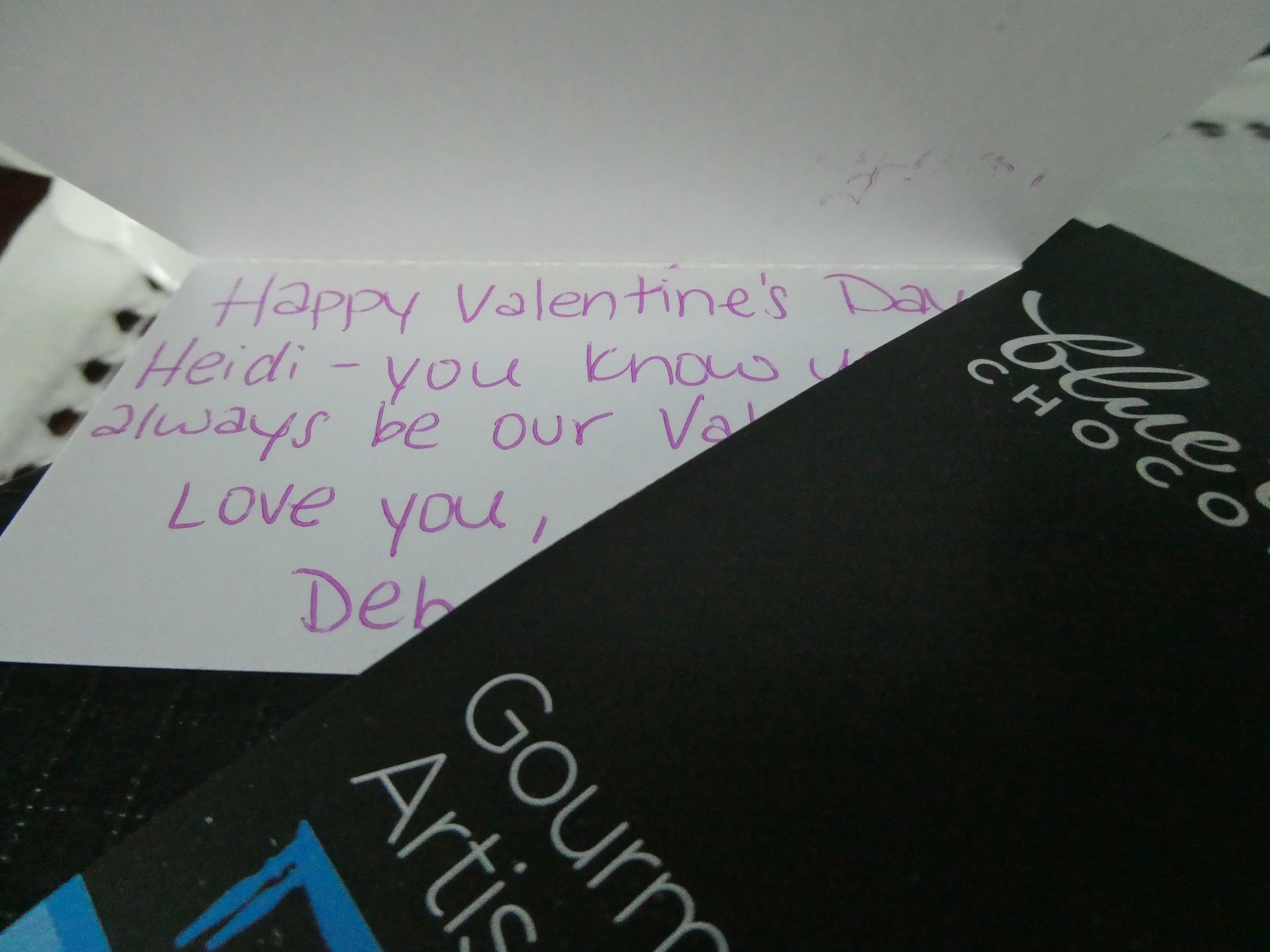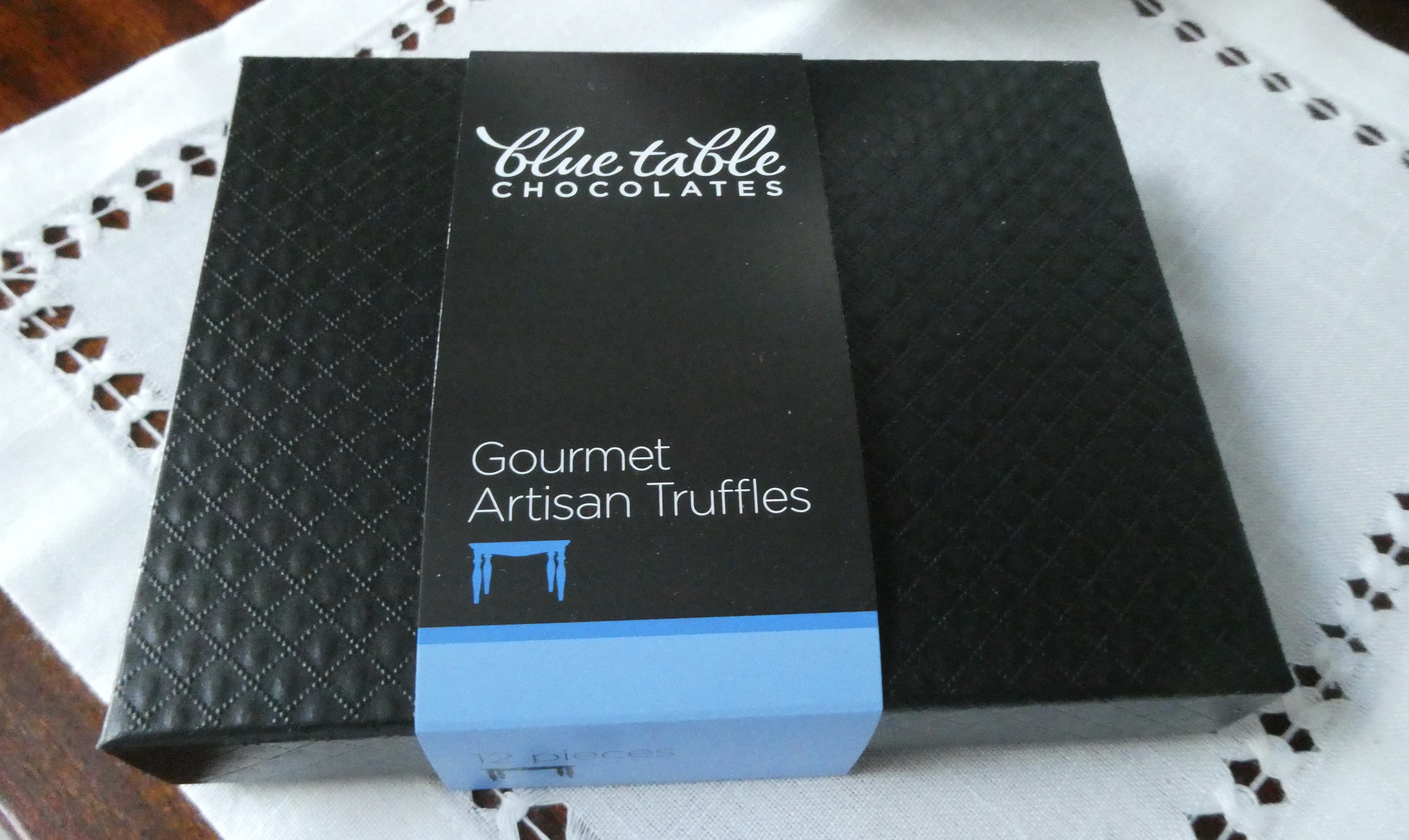 In addition to another lovely card for Valentine’s Day this year, Deb sent me some chocolate. Not just any chocolate, but gourmet artisan truffles! A lovely box arrived from Blue Table Chocolates.