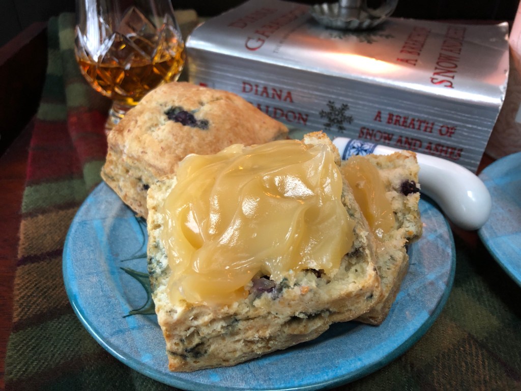 My teacup and dessert dish are from my Scottish Tain Pottery collection and although the scarf tartan is not the Fraser tartan, it IS my husband’s Buchanan hunting tartan and it’s made of 100% Scottish lambs wool. The hunting version is a less vibrant version of the very yellow modern version.