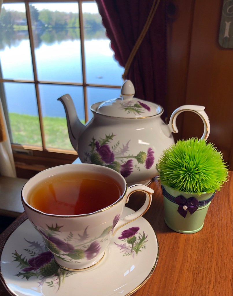 There’s a wee bit o’ Scotland in the home office this morning. I brought out my lovely English-made, Duchess fine bone china teapot and cup purchased at the Maine Highland Games many years ago. The national emblem of Scotland, the delicate thistles painted on the china belie the vicious spines that cover and protect the plant like a porcupine. As a result of those prickly posies, the thistle has no natural enemies.