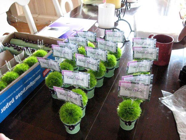 The fuzzy little decoration in the light-green metal bucket is a homemade creation my husband and I made for our wedding in 2010. They held the name cards for our wedding reception tables.