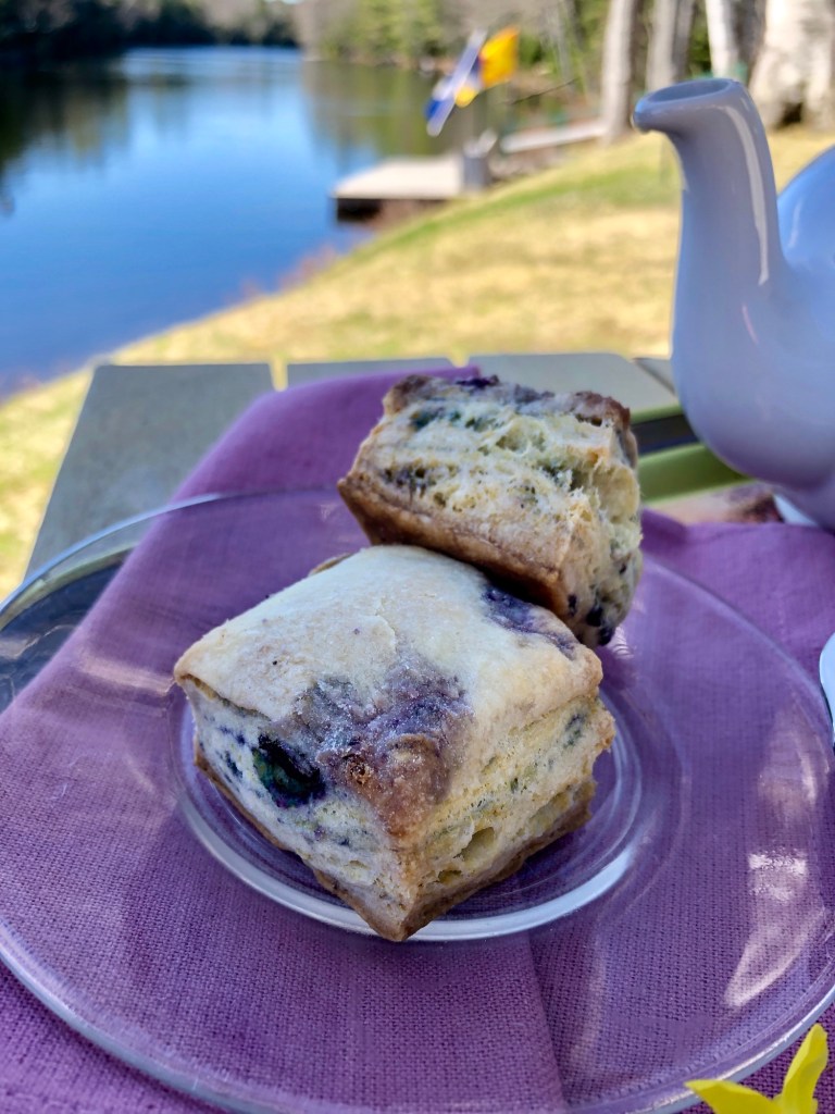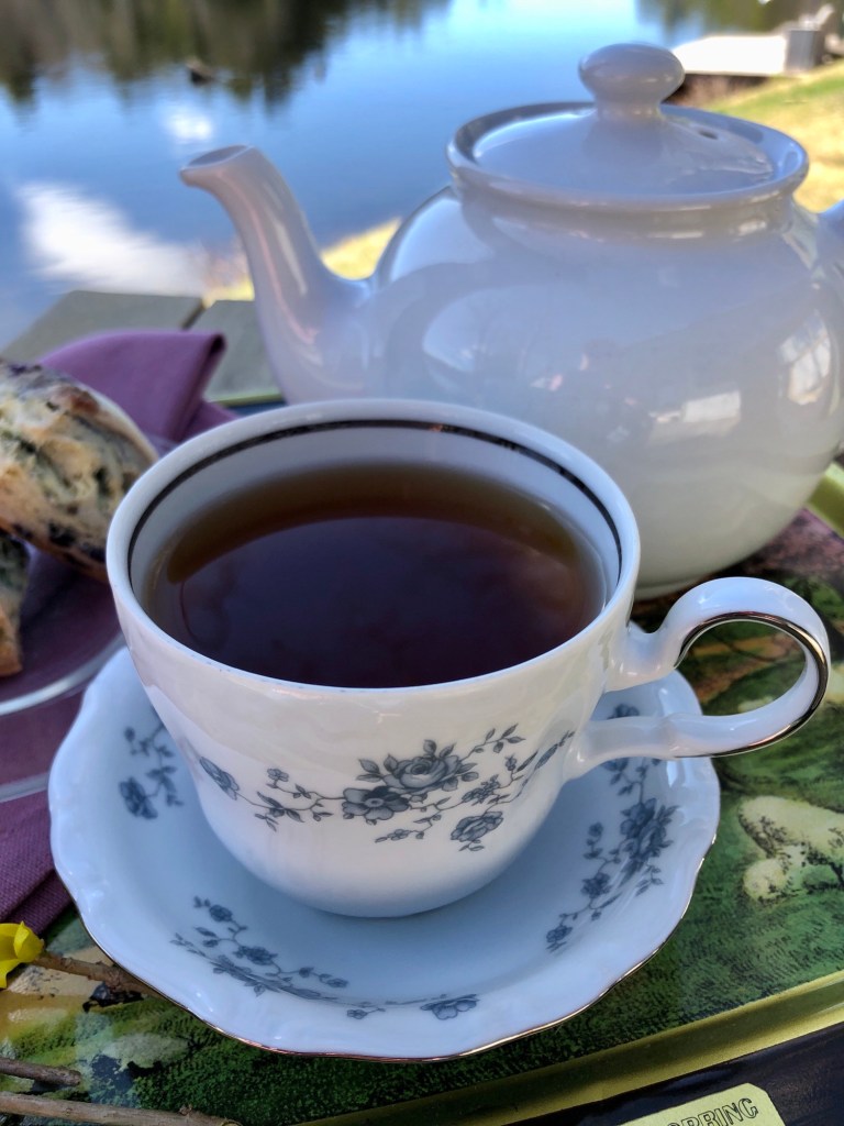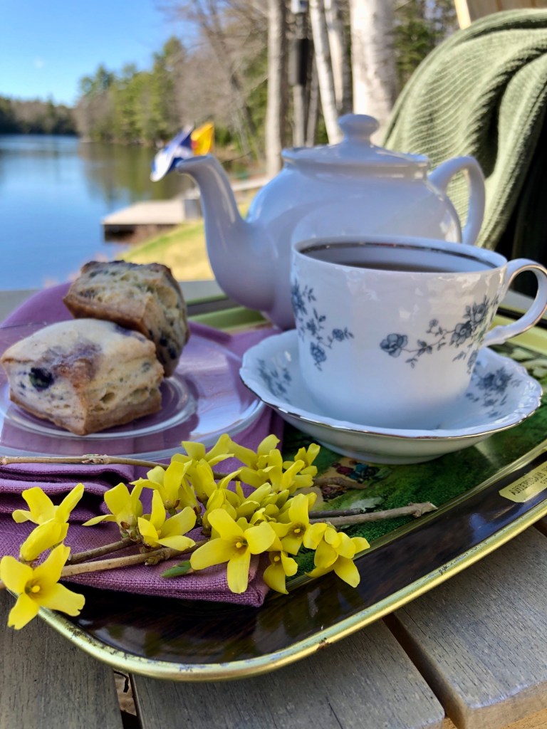 I whipped up a pot of Mrs. Grey Tea from local tea blender Tempest In A Teapot and some blueberry scones. With a simple white teapot and a lovely blue-flowered teacup, I was only missing some real flowers. Thankfully the forsythia bush was starting to bloom.