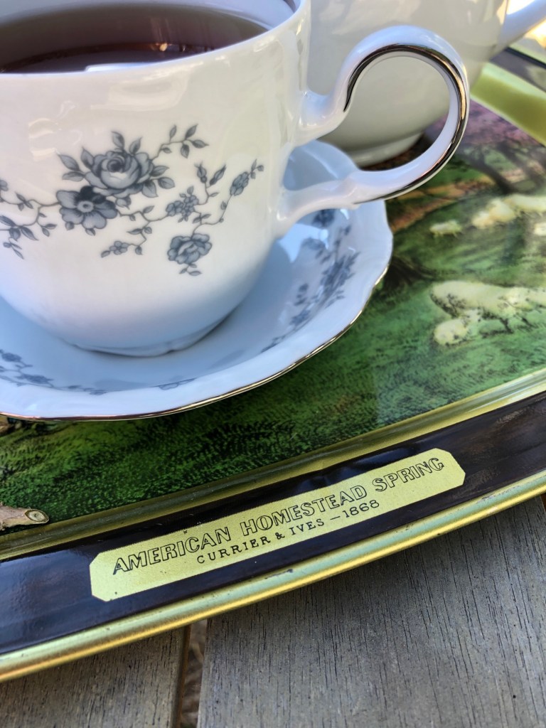 My Currier & Ives spring-themed tray pulled it all together as I enjoyed my annual review of my old Victoria, Tea Time, and Cottage Style magazines on the deck. I was also being closely watched by the kitties in the window.