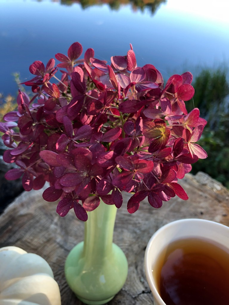 Pumpkins, fall foliage, dried hydrangeas, hot tea, and scones. Bring on the cozy!