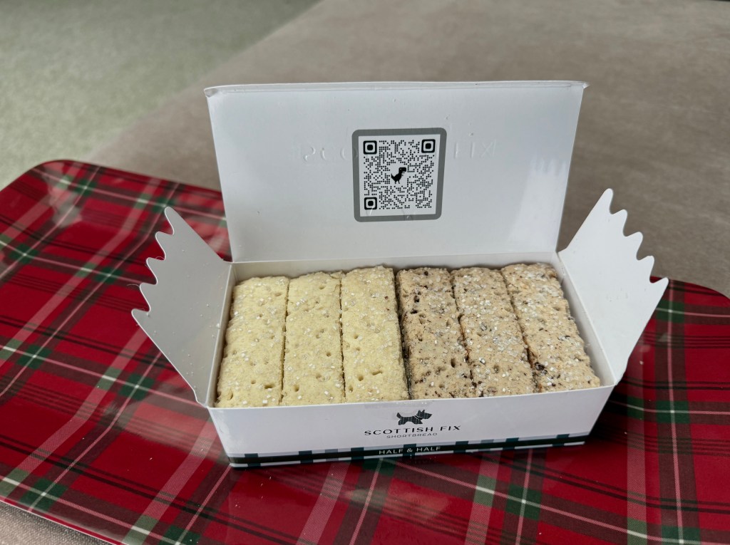 The shortbread? Well, that’s from Scottish Fix in Danbury, CT. I purchased the Half & Half box which contained six biscuits each of Ghirardelli chocolate and Traditional shortbread with a sprinkling of sparkling sugar. Shipping was very quick and there was a lovely handwritten note from owner Angus Scott tucked into the cute box stamped with a Scottie dog.