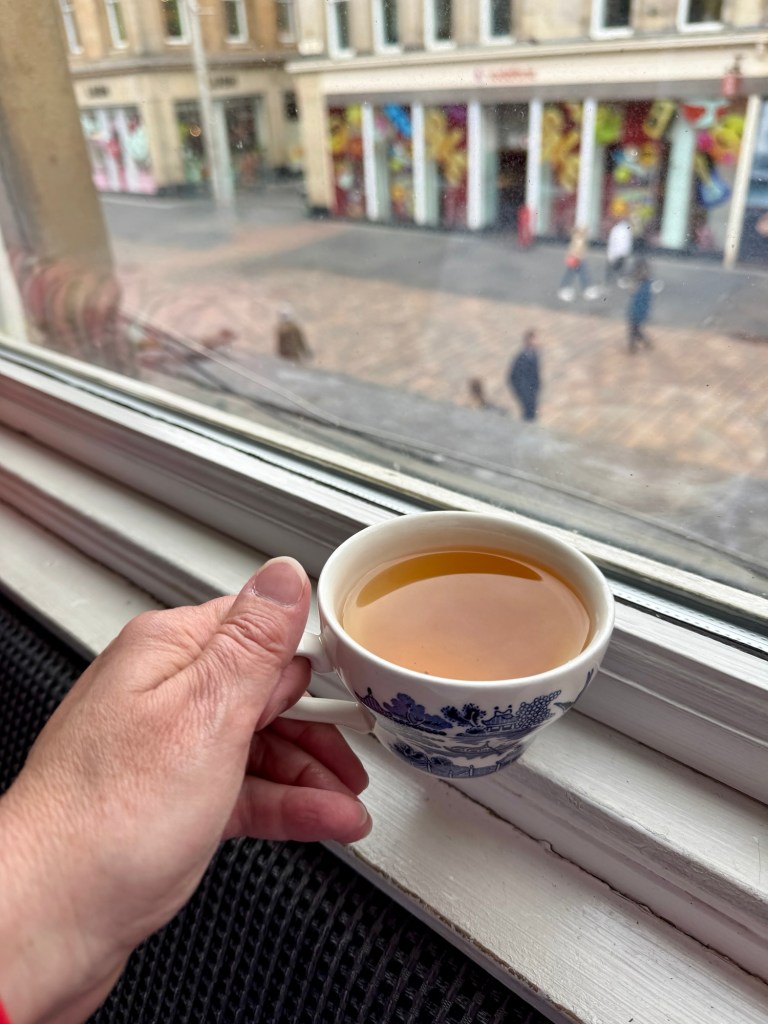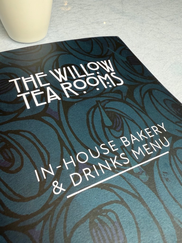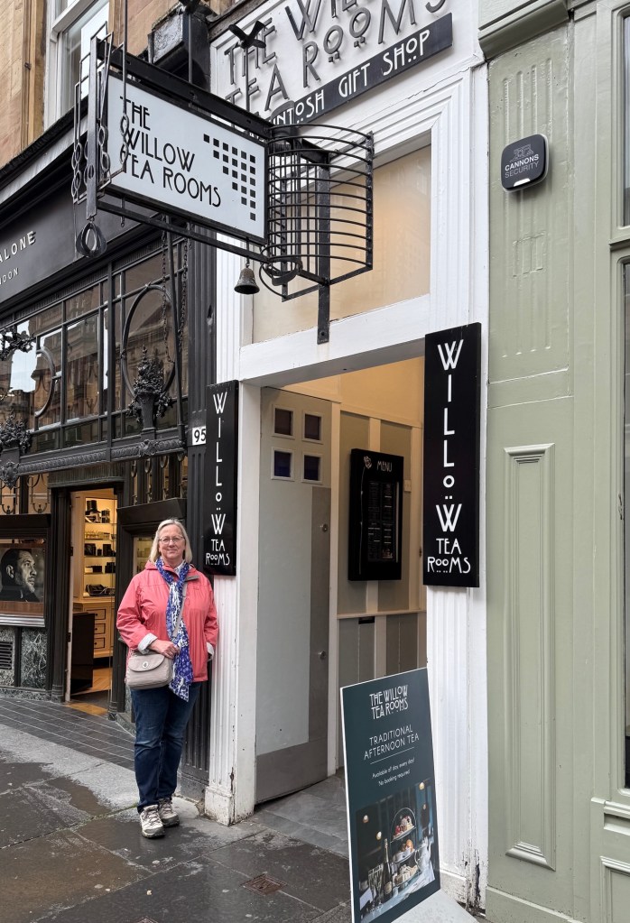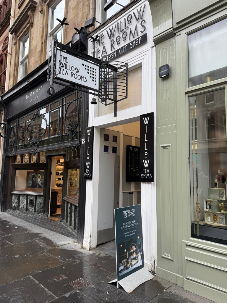 During our recent trip to Glasgow, Scotland, we enjoyed lunch at the Willow Tea Room inspired by the art nouveau designs of Charles Rennie Mackintosh and modeled on Kate Cranston’s Ingram Street Tea Rooms from the early 1900s. The actual door to the tea room is so small, one might miss it amongst the large floor-to-ceiling big, box stores surrounding it.