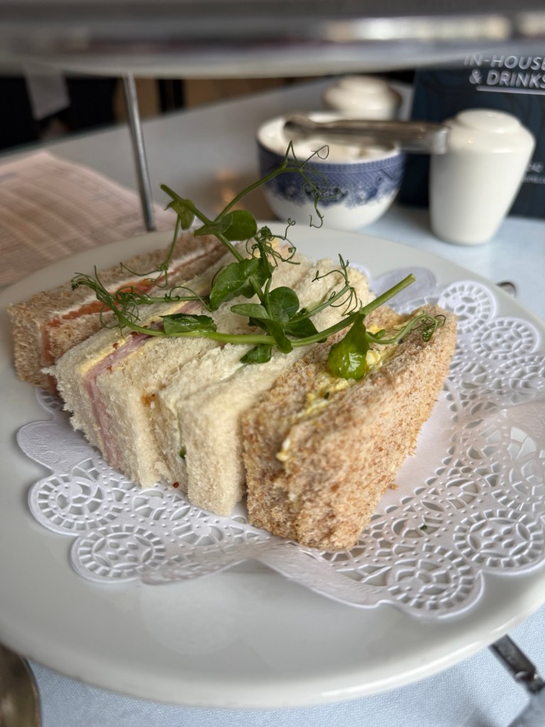 It’s not my favorite pattern, but I really didn’t care at that point. The Prosecco had arrived and it was probably some of the best Prosecco I’ve ever had. Then the 3-tiered food tray arrived with four yummy sandwiches, a small, but VERY good fruit scone with jam and cream, and a single shortbread cookie and a lemon meringue tart, which melted in your mouth. I’m still not a fan of salmon, so Dave finished that sandwich for me, but everything else was consumed and enjoyed. The teapots were small and because I ordered the afternoon tea service, they provide a free “topping off” (refill) of the tea, so I asked for that.