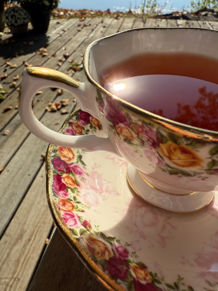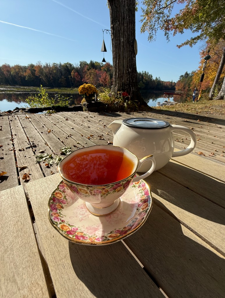 Today, October 5th is my 19th annie-versary. AND it’s a beautiful day here in Maine, so I enjoyed a large pot of my favorite tea, Fortmason from Fortnum & Mason out on the deck in one of my favorite teacups.