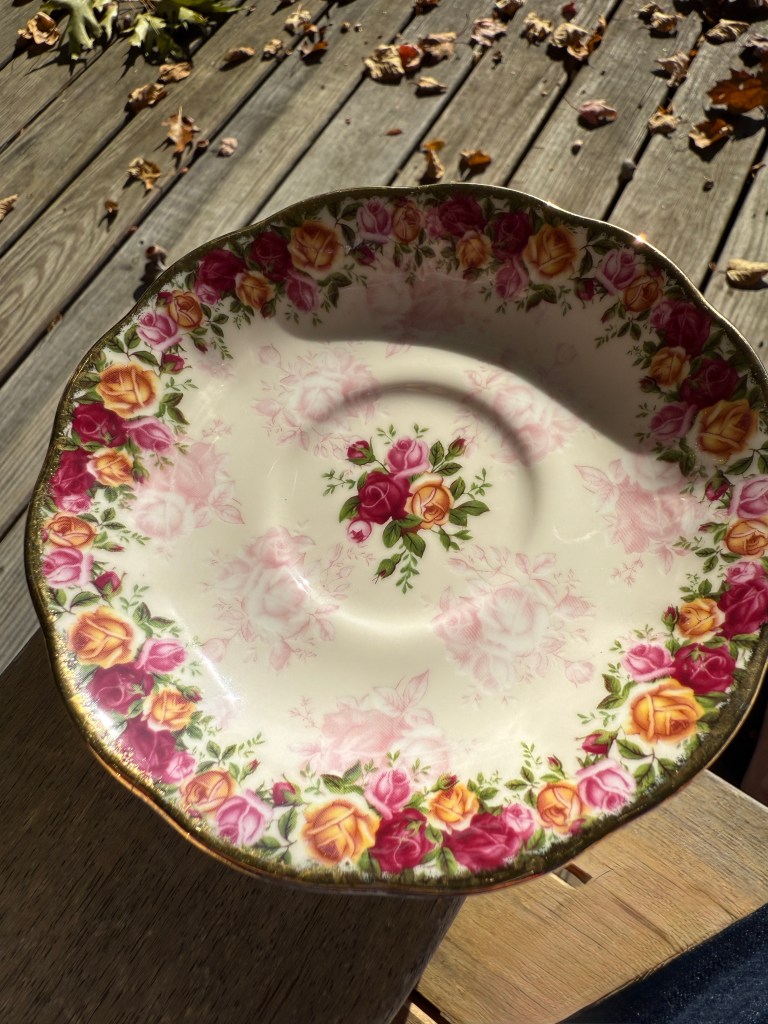 The Peach Damask, Old Country Roses pattern on this Royal Albert china teacup is a favorite as well as the handle on the teacup. Many teacups don’t allow you to hook your finger through them. No doubt because etiquette doesn’t allow one to hold your teacup in that fashion. But with my shaky hand, it’s a stabilizing feature and this teacup allows that. I also find peach and rose pattern really lovely.