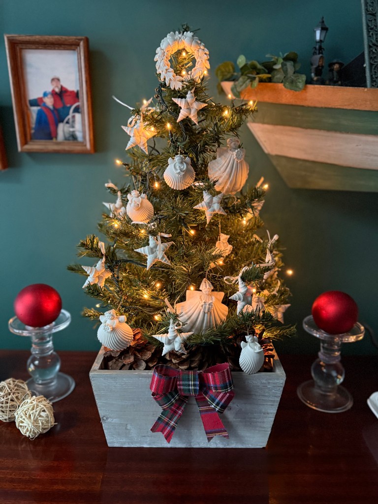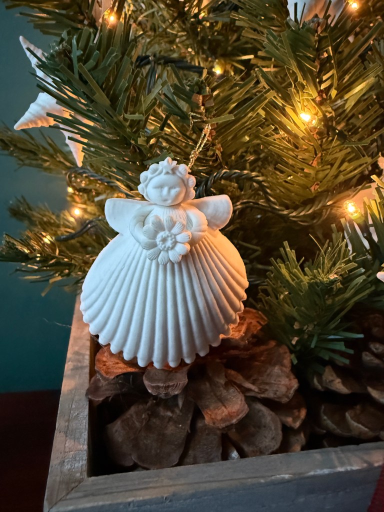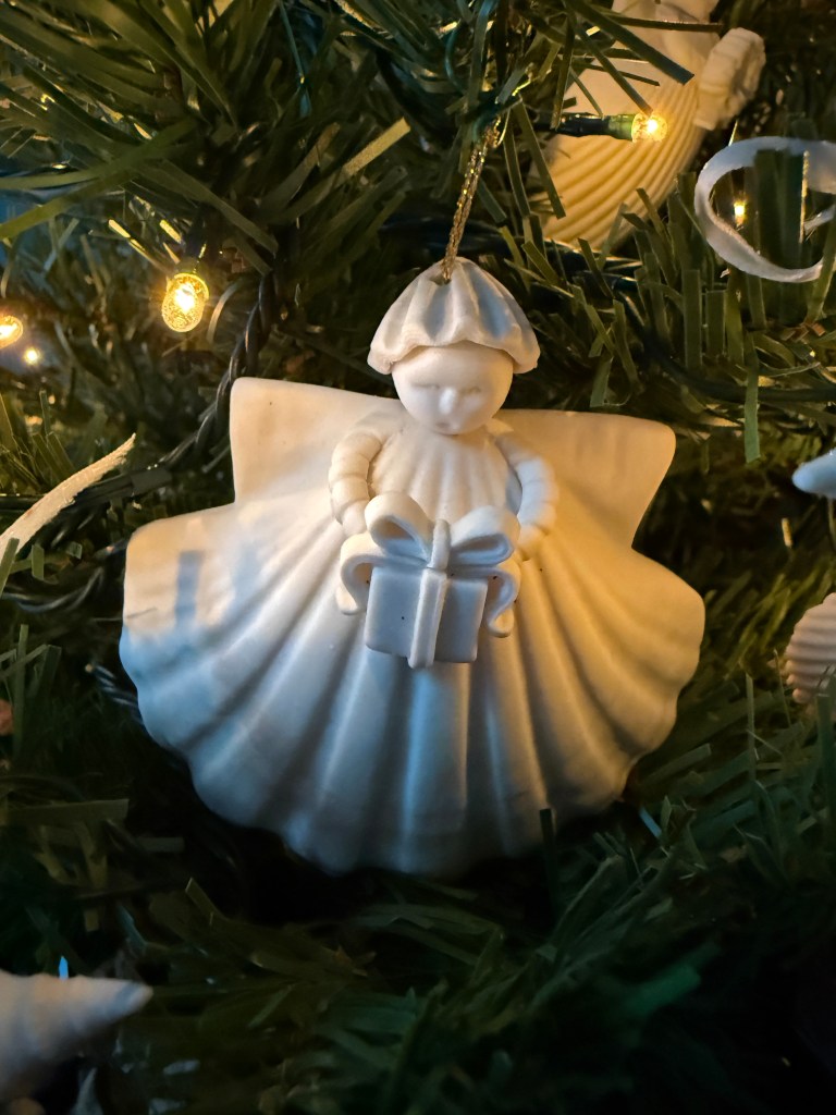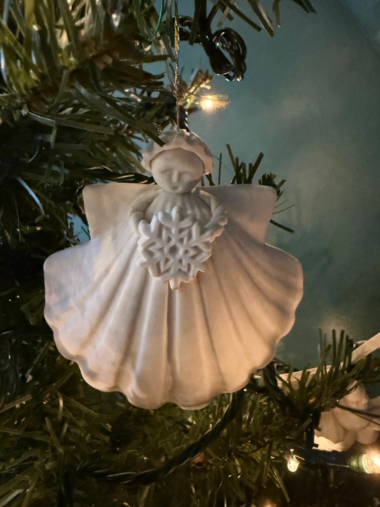 The angel-seashell ornaments are really lovely and they’re always holding onto something unique and special. I have ones that are holding on to a watering can, Christmas wreath, teapot, teacup, flower, birdhouse, Christmas present, and a snowflake. There are also two different sizes. All these pieces have made the move to multiple apartments in NY and then to Maine 25 years ago without any breakage.