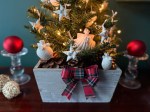 This year, I placed the small tree in a wooden crate filled with large pine cones, added some white lights, and used a wreath as the tree topper. Adding a simple plaid bow completed the simple design. The tree sits on a dresser in the bedroom where it’s usually the last thing I turn off at night.