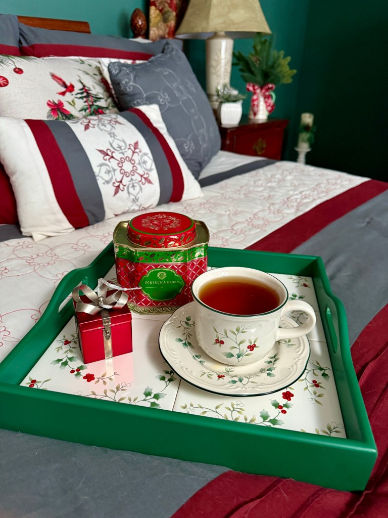 I pulled out the colorful tin of Fortnum & Mason Christmas black tea and enjoyed a mug of warming tea in bed. Archie, one of our two kitties, decided to join me.