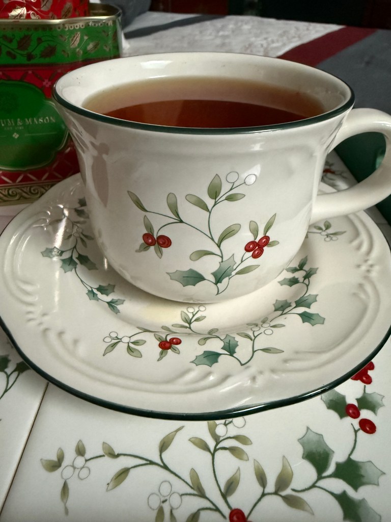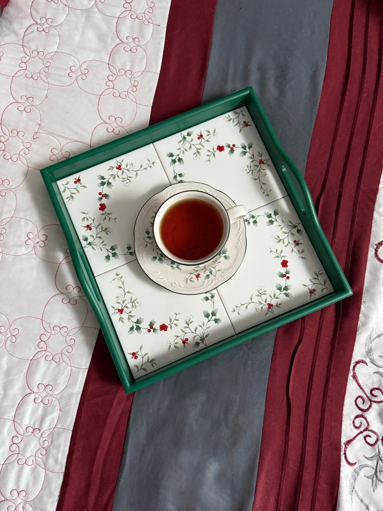 I know HE doesn’t care that it’s the first time I used my new wooden tray that I picked up for a fantastic price on eBay, but I cared. The tray is beautifully made with a heavy wooden base and four ceramic tiles edged with the Pfaltzgraff Winterberry pattern to match the teacup and saucer I already had.