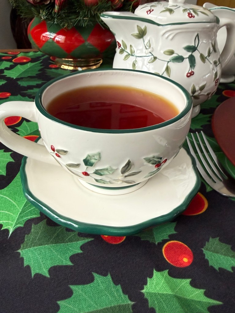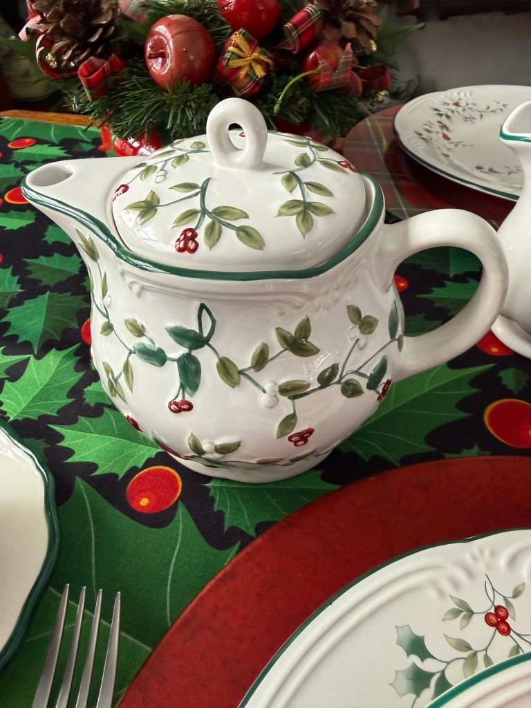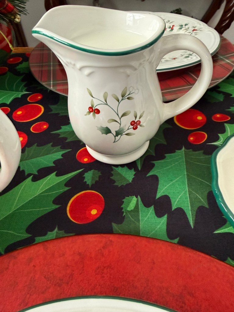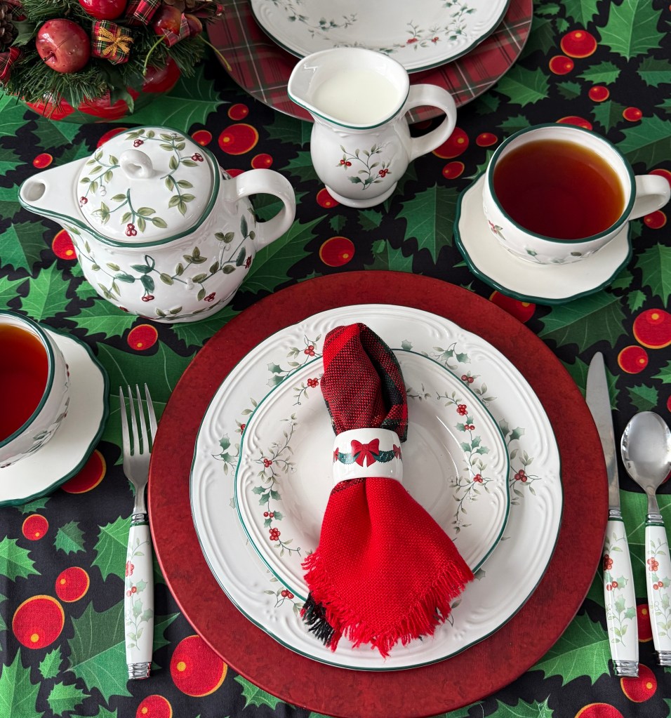 I am finally able to set my table with Christmas plates and silverware that match my Pfaltzgraff Winterberry collection. Using a lovely table cloth that was gifted to me by my niece a couple years back, the new plates really pop! Especially on the red charger that I’ve never used for its actual purpose before.