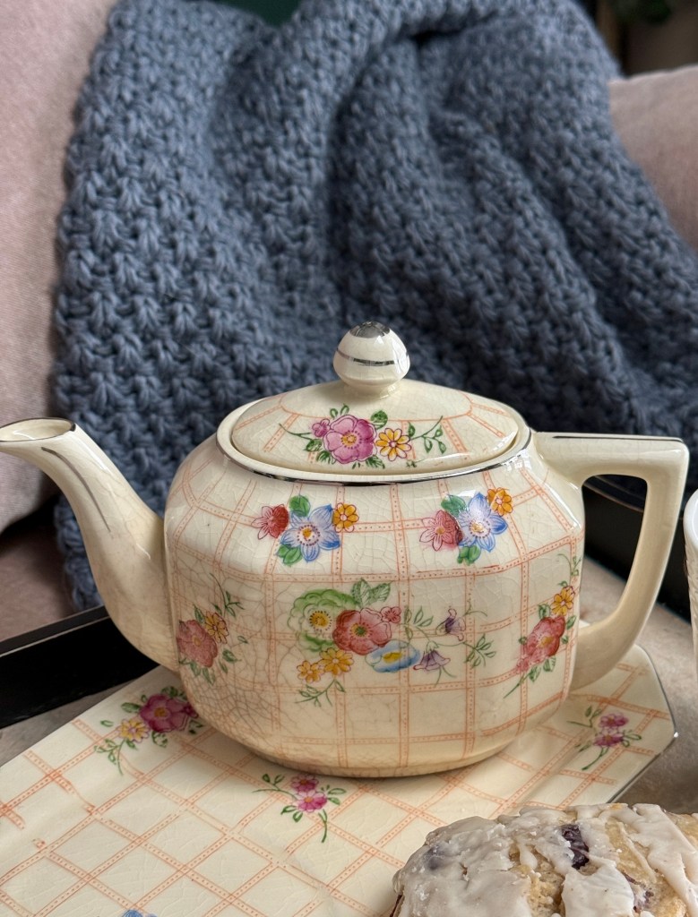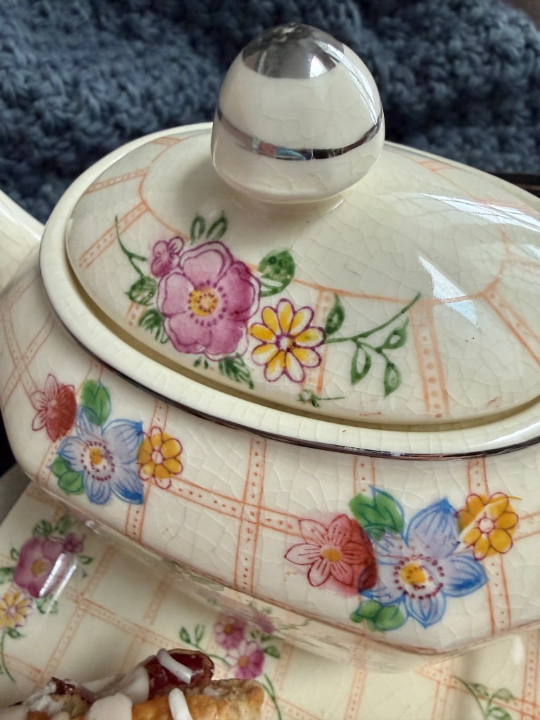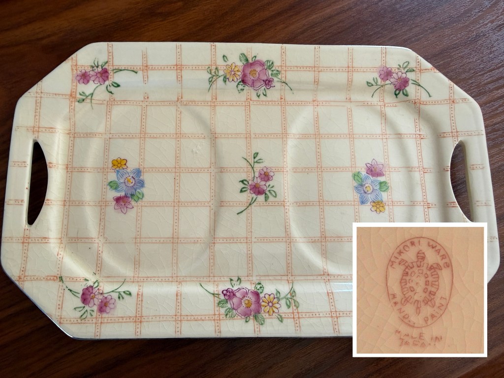I grabbed a lovely vintage Mikori Ware teapot and tray. The set is made in Japan probably from the 1940-1950’s. Where the pottery shows its age with cracking on the glazing, the beautiful hand-painted flowers are delightfully intact on top of the glaze. It’s worth a closeup look at the photos below.
