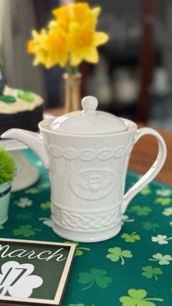 My cake stand, plate, and teapot are from the Belleek Claddagh Tableware collection, featuring the iconic Claddagh motif. The Claddagh motif represents love (the heart), friendship (the hands), and loyalty (the crown). It is a traditional Irish symbol often used in jewelry, particularly in Claddagh rings.
