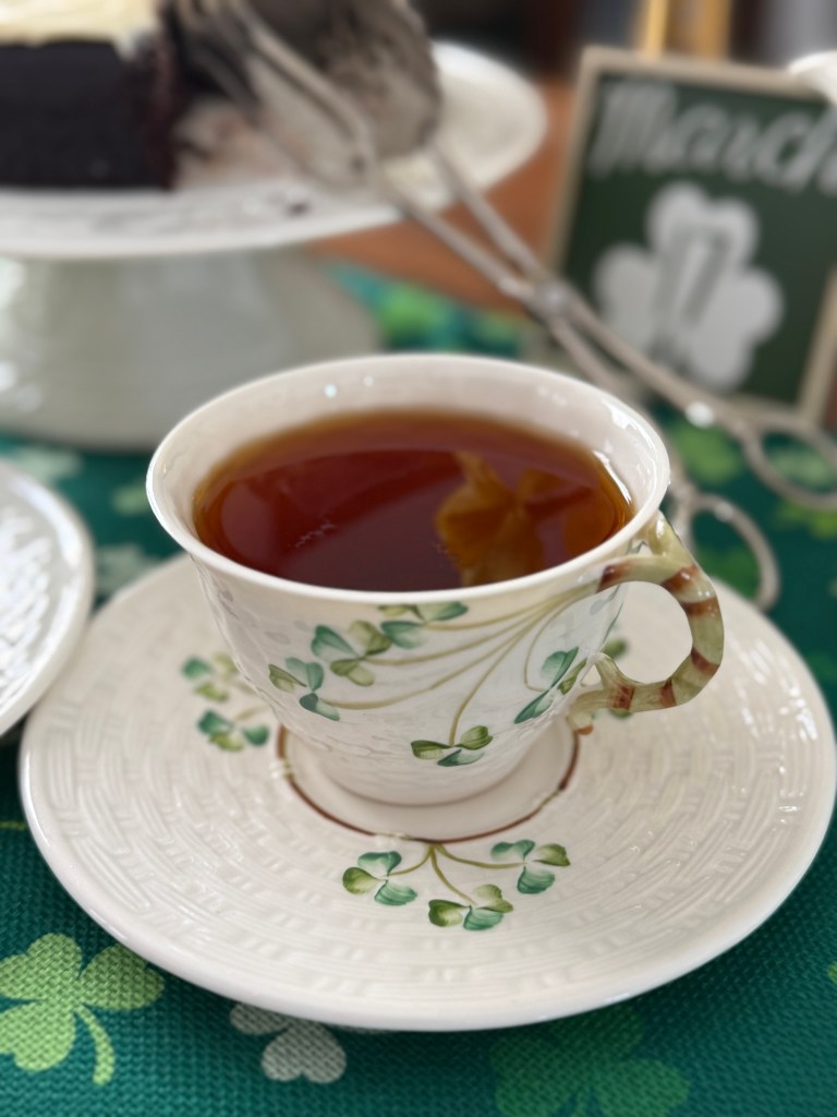 While I do have some Irish tableware, surprisingly, I hadn’t acquired any teacups over the years. So, just as I did for Christmas, I ventured into the eBay universe and found two, slightly used teacups and saucers with the Shamrock design for a terrific price. They are in beautiful condition!